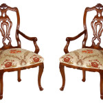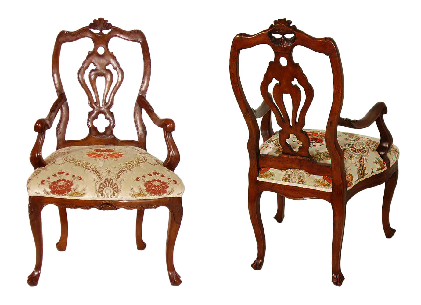 Antique pair armchairs, venetian baroque chairs of the 18th century in solid walnut. Great frame and details. Each with a pierced shaped back with a carved shell, flanked by outscrolled arms and supported by cabriole legs ending in scrolled toes. Seat upholstery redone entirely with floral fabric. This type of chair is the triumph of lightness and movement: the wood is fluid, working with ductility and freedom.